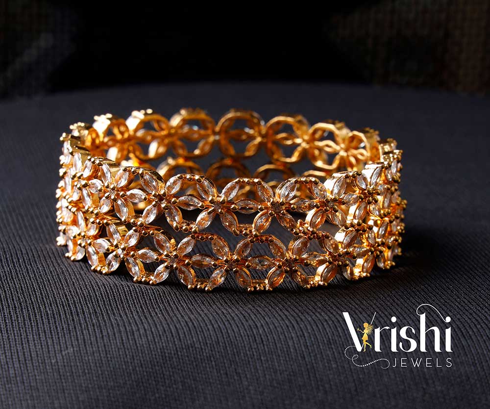Radiate elegance with our White Stone Flower Bangle, a delicate fusion of sophistication and charm. Add a touch of floral grace to your ensemble. Shop now for timeless beauty.